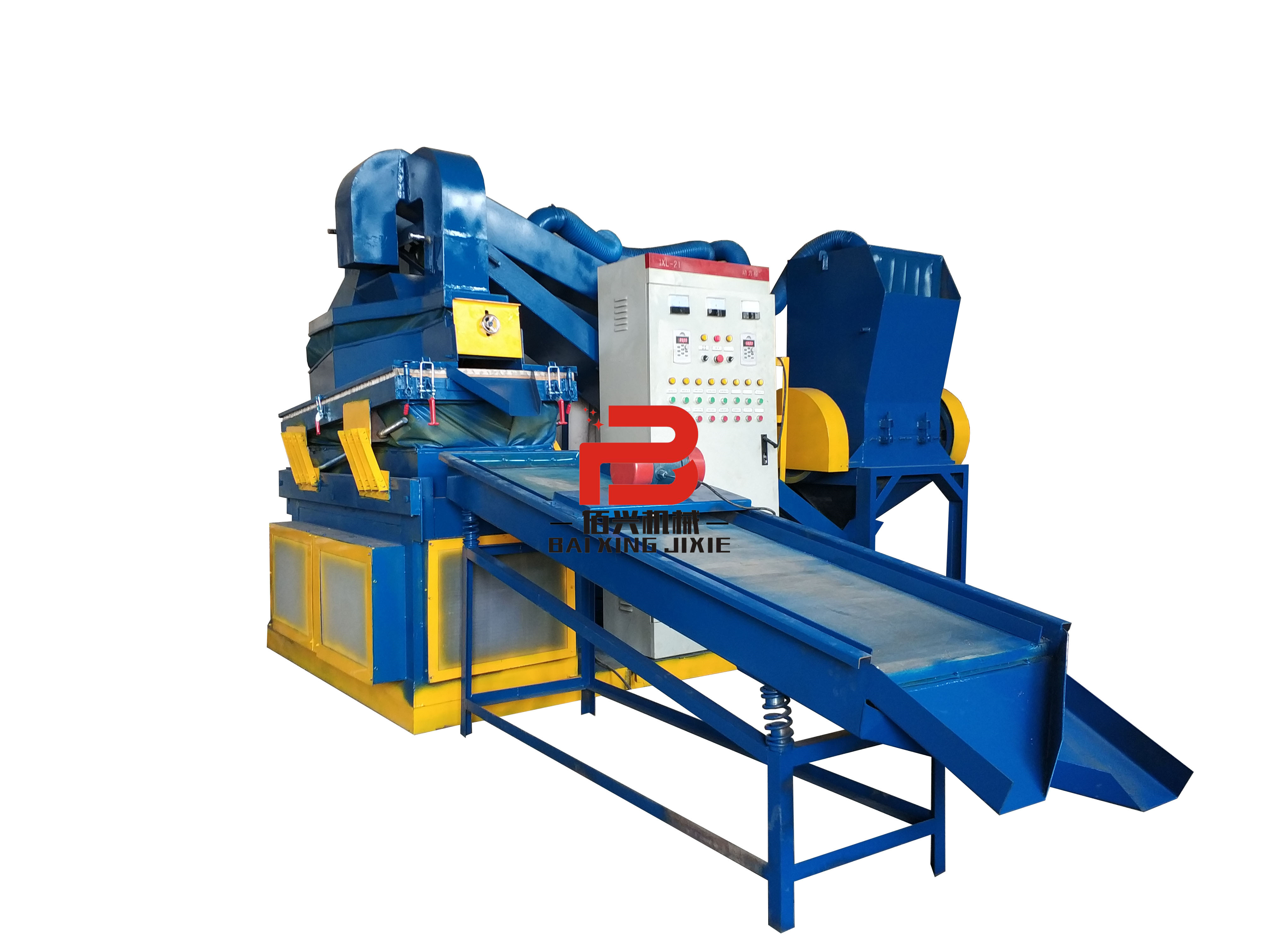 生產(chǎn)過(guò)程:上料、破碎、破壞、比重分選,銅線線徑巨細(xì)調(diào)整振動(dòng)篩角度,經(jīng)振動(dòng)篩選,銅米粒與塑料將自選分離;混合料口的物料流入至吸風(fēng)管,經(jīng)循環(huán)風(fēng)管送至而到破碎;振動(dòng)篩上方的吸風(fēng)管將振動(dòng)篩空間中的塑料纖維及其他塵埃吸至除塵裝置處理;前后兩邊的出料口,分別出銅和塑料線皮。